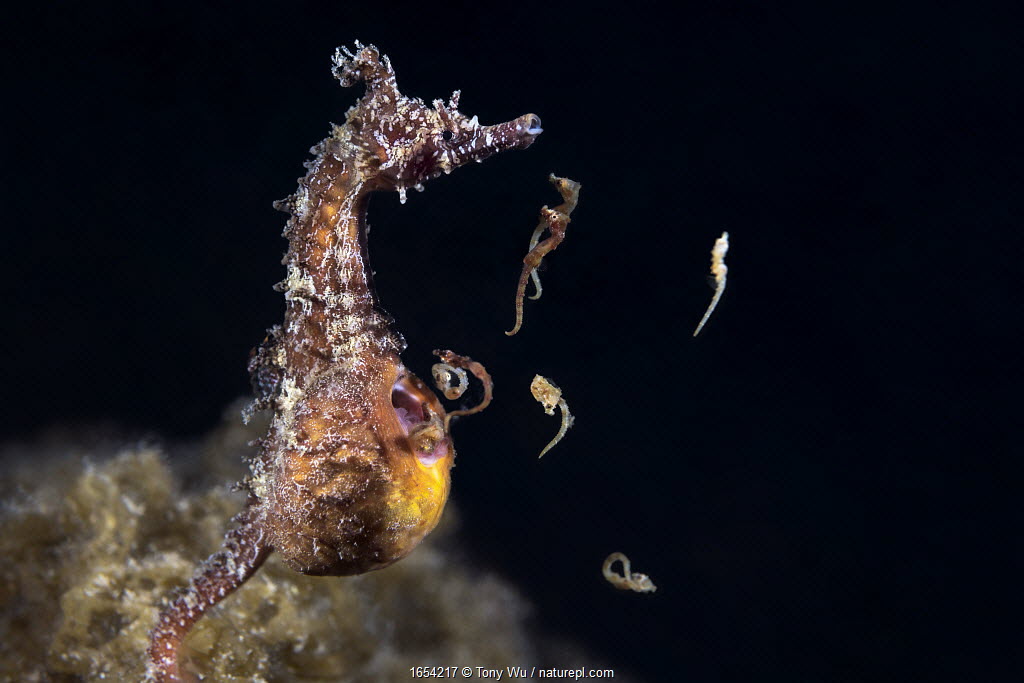 Male Korean seahorse (Hippocampus haema) giving birth. Some of the babies are still curled up inside their egg membranes. Kumamoto Prefecture, Kyushu, Japan.